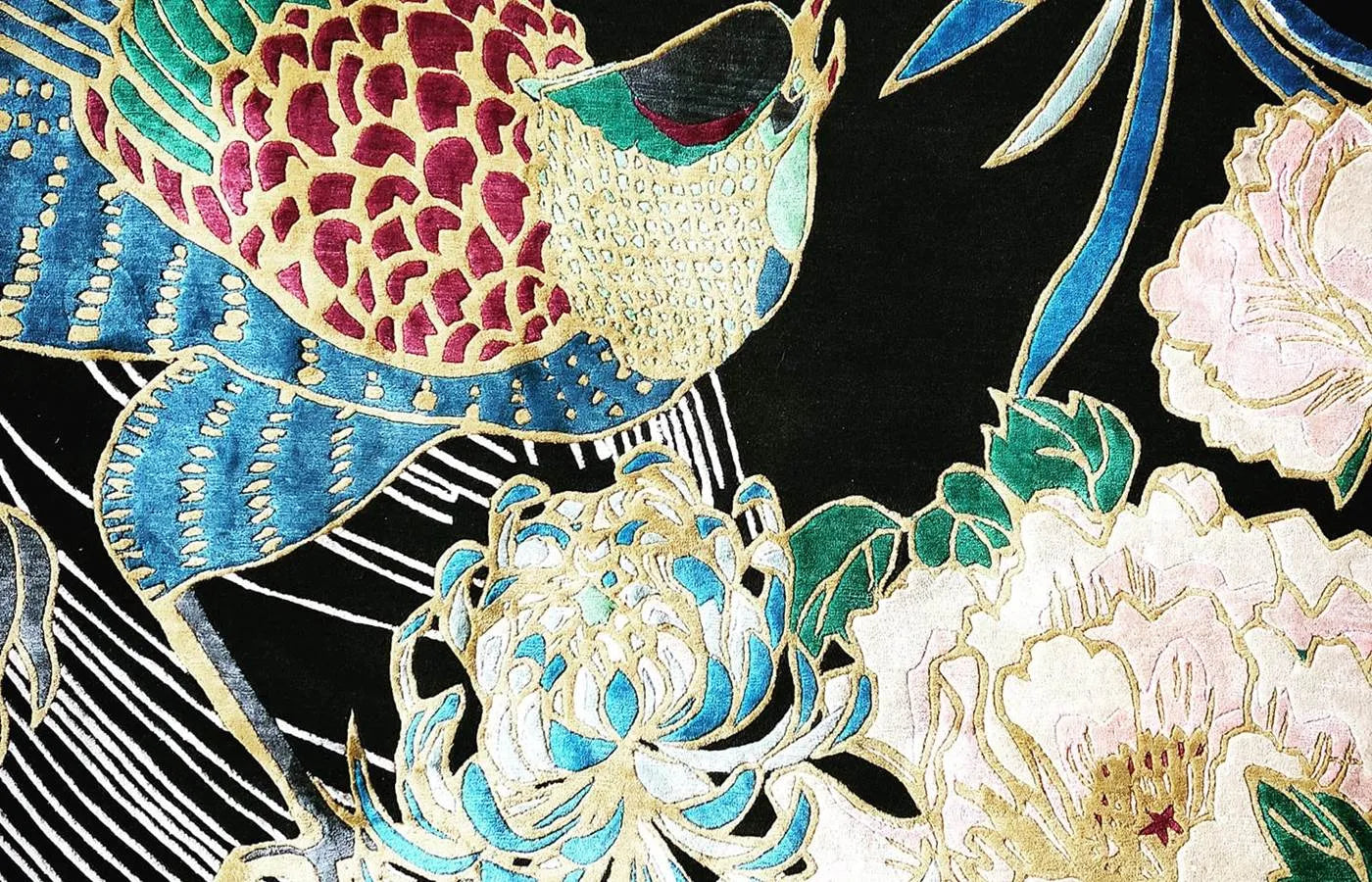 Finishing starts with the combing process, which does just what you might imagine and removes excess yarn, as well as trims and neatens stray threads. Shearing ensures the pile height is the same across the entire rug; this is also physically demanding work. A carving process, to sharpen every design detail, can require more than one person to complete the work. The more complex the pattern, the longer the process: a rug like Plumage takes a full day’s work to carve. Once the surface is approved, the edges of the rug are bound.