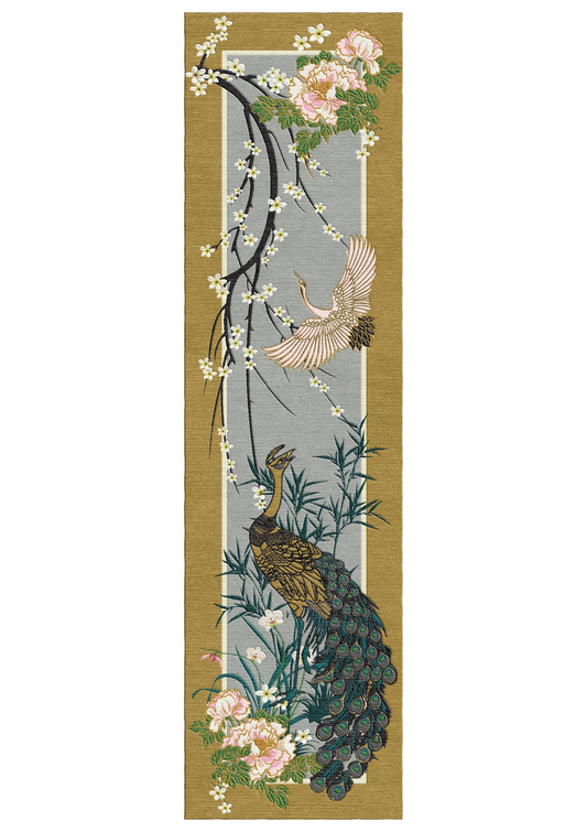 Inspired by Chinese symbolism and its close links to nature, Chinese Garden of Virtue presents plum blossom, orchids, bamboo and chrysanthemums, all of which convey positive messages, as an elegant backdrop to a beautiful peacock, which symbolises dignity and beauty, and a soaring crane, representing a long and happy life.