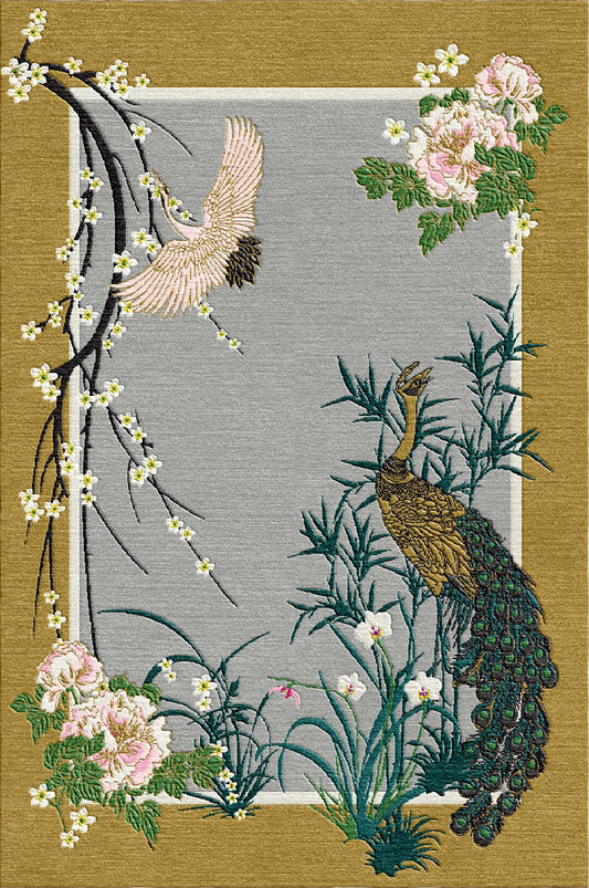 Inspired by her earlier Chinese Garden of Virtue design. Our Chinese Garden of Virtue runner is inspired by Chinese symbolism and its close links to nature, Chinese Garden of Virtue presents plum blossom, orchids, bamboo and chrysanthemums, all of which convey positive messages, as an elegant backdrop to a beautiful peacock, which symbolises dignity and beauty, and a soaring crane, representing a long and happy life.