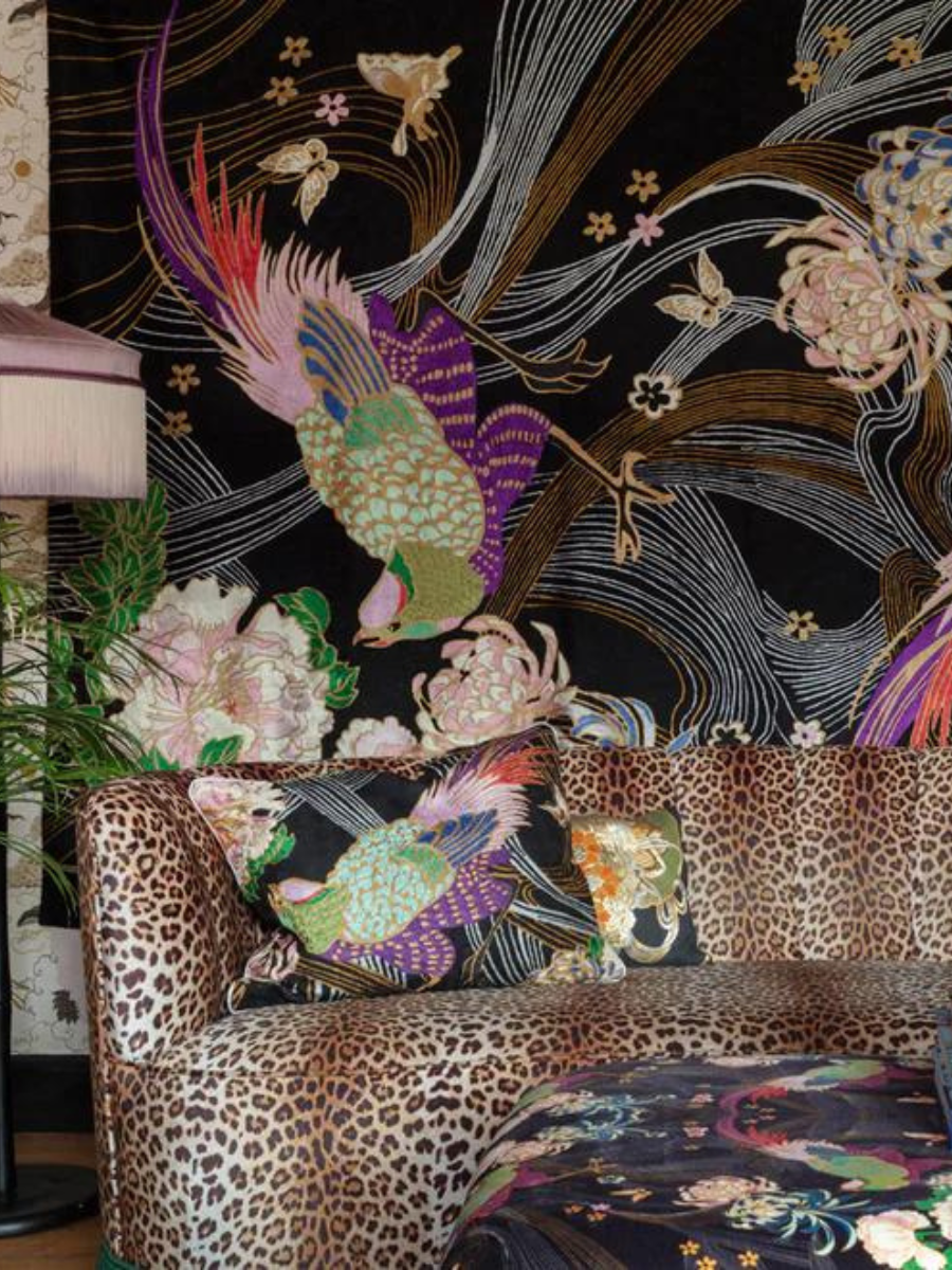 Inspired by the intricate embroidery of Japanese kimonos, this luxurious wall-hanging has a phoenix at its centre, which represents the cyclical nature of life, rebirth and renewal, surrounded by glorious chrysanthemums in full bloom and playful, fluttering butterflies.