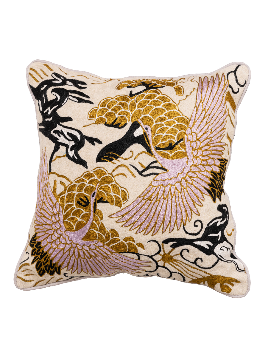 This beautiful piece combines storytelling through Oriental symbolism, and is composed of almost all the symbols depicted in both Korean and Chinese philosophy for a long and happy life. Inspired by our Eternal Toile Hand Knotted Rug, Wendy's hand-drawn design has translated elegantly into cushion form by celebrating the art of crewel embroidery.