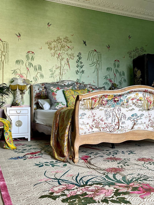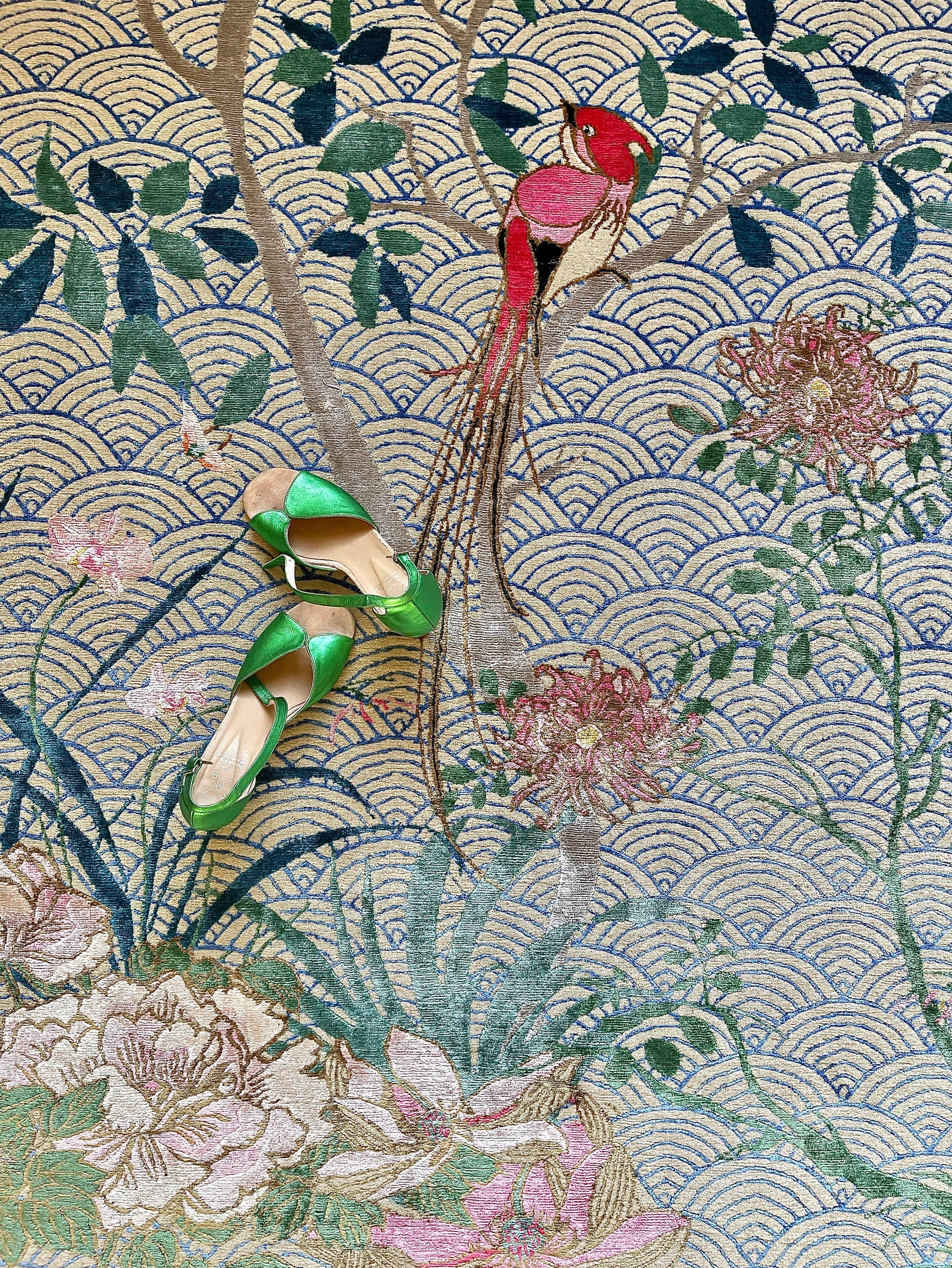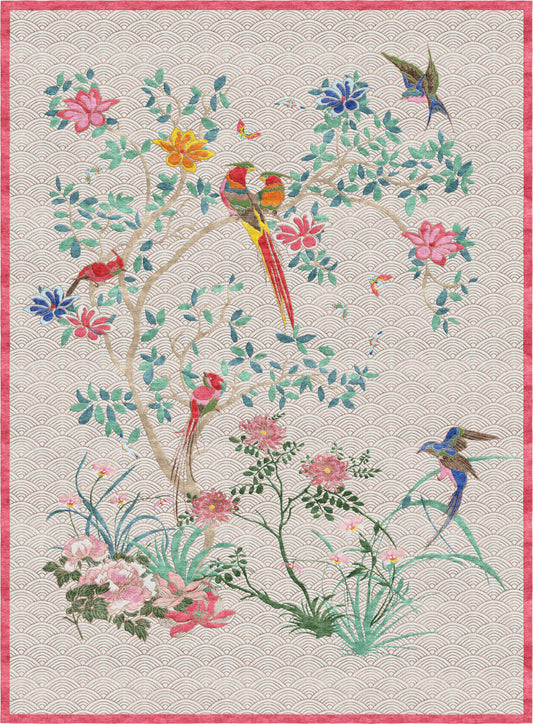 Floral Waves is inspired by Japanese culture. Layers of concentric circles portray waves, which represent the ebb and flow of the tide providing strength, security and surges of good luck. The symbol was originally used on ancient maps to China to depict the sea before becoming a popular motif in Japan to decorate kimonos, ceramics and lacquerware. Colourful tropical birds and flowering magnolias, which symbolise beauty and gentleness, reflect the connection with and a love of nature.