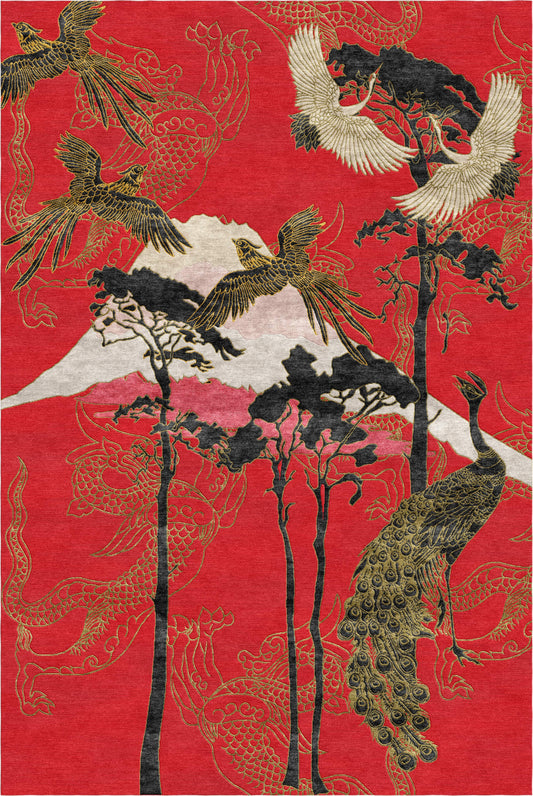 This vibrant shimmering rug brings together bold, dynamic red and warming gold, with a splash of pink for love, in a mesmerising tale of Chinese philosophy and symbolism.