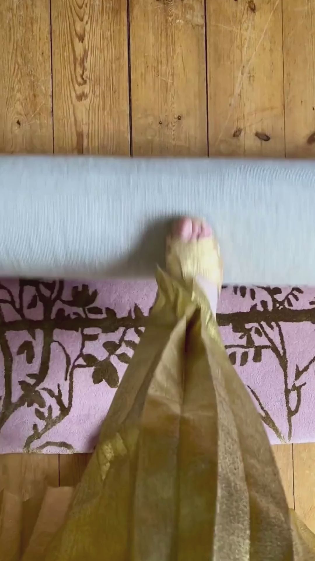 Inspired by her earlier Secret Garden Lotus Pink design, Wendy has added a gold frame to bring a traditional chinoiserie twist. A wool base with a border of sparkling gold flora silhouettes and highlights of bright colourful birds in Tencel.