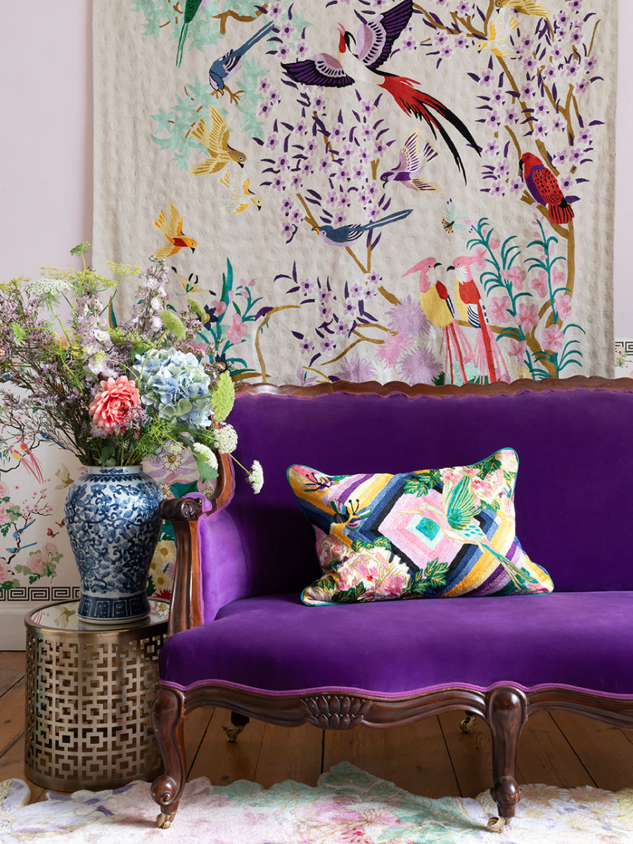 Colourful hummingbirds and butterflies, and gorgeous chrysanthemums and lotus flowers fill our Joy cushion full of colour, pattern and positivity; she tells a powerful story of hope and optimism. Bright motifs etched in gold stand out against a pale backdrop, while the skilled crewel embroidery work creates an embossed effect and soft-as-silk finish.