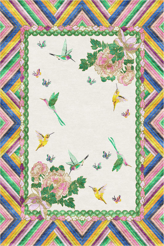 With her eye-catching pale central panel, which grounds the pinks, blues, lilacs, purple, greens, olive and red that burst into life around it, Joy balances colour and pattern beautifully. Effervescent hummingbirds, a delightful symbol of joy, dart amongst bright flowers and vibrant green foliage, all etched in gold and framed by a bold, striped border.