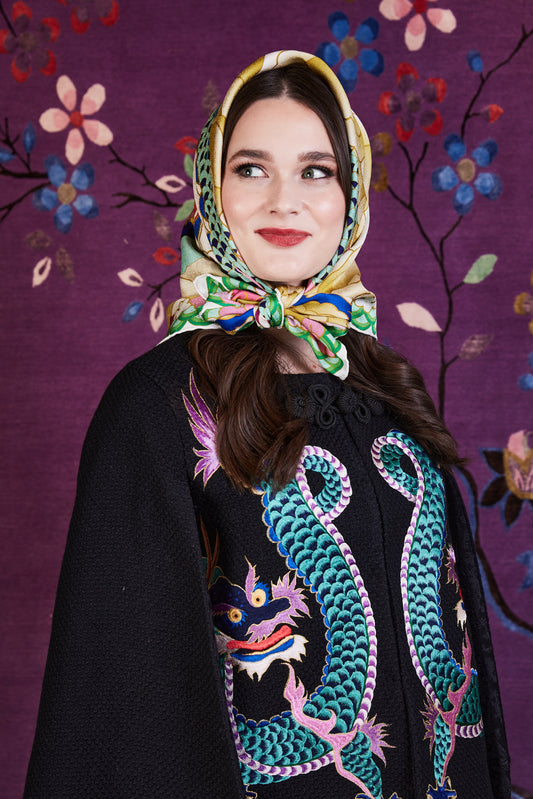 The jacquard weave gives the silk a subtle texture and depth, allowing the colours to shift gently with movement and light. Lightweight yet structured, the scarf drapes beautifully and can be styled in multiple ways — worn around the neck, tied as a headscarf, or used as a refined accent on the hair or handbag.