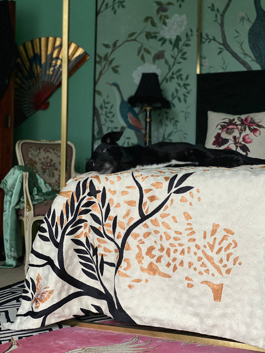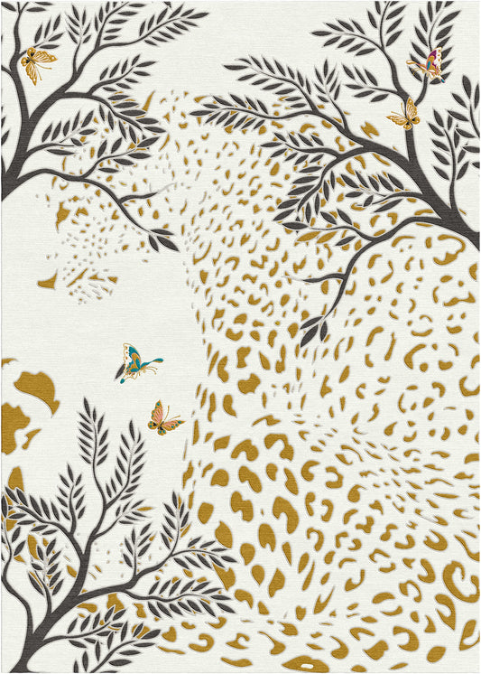 A stunning leopard design that combines bold imagery with neutral tones to create a head-turning rug that is still easy to place in the home. Light and bright with a gold Tencel leopard shimmering amongst butterflies and foliage, this is a statement piece that doesn’t shout but always gets noticed.