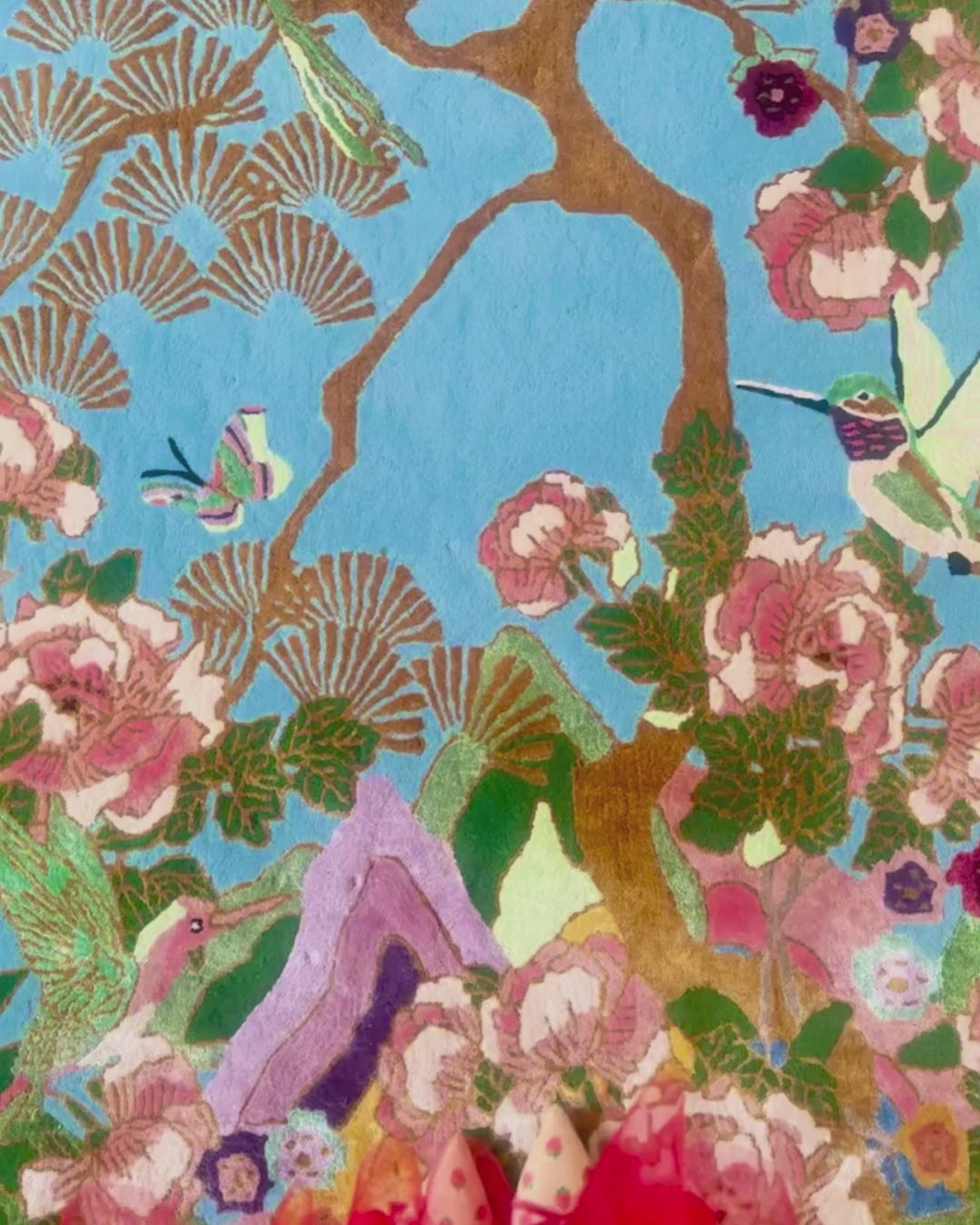 Her vivid design grows around a golden pine tree rising from mountains and set against a backdrop of summer-blue sky. The slim pine with delicate fan-shaped branches is surrounded by pretty peonies, colourful chrysanthemums, and lush foliage, dotted with joyful hummingbirds and beautiful butterflies; all images with positive symbolism.