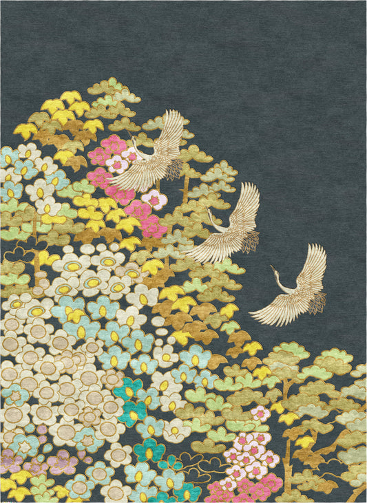 A dark grey base grounds the glorious colours of the flowers, foliage and elegant cranes that bring this handmade runner to life. Glorious gold-etched cranes, which are a symbol of longevity, peace and wisdom, soar serenely above the florals, resulting in a luxurious rug full of glamour and elegance.