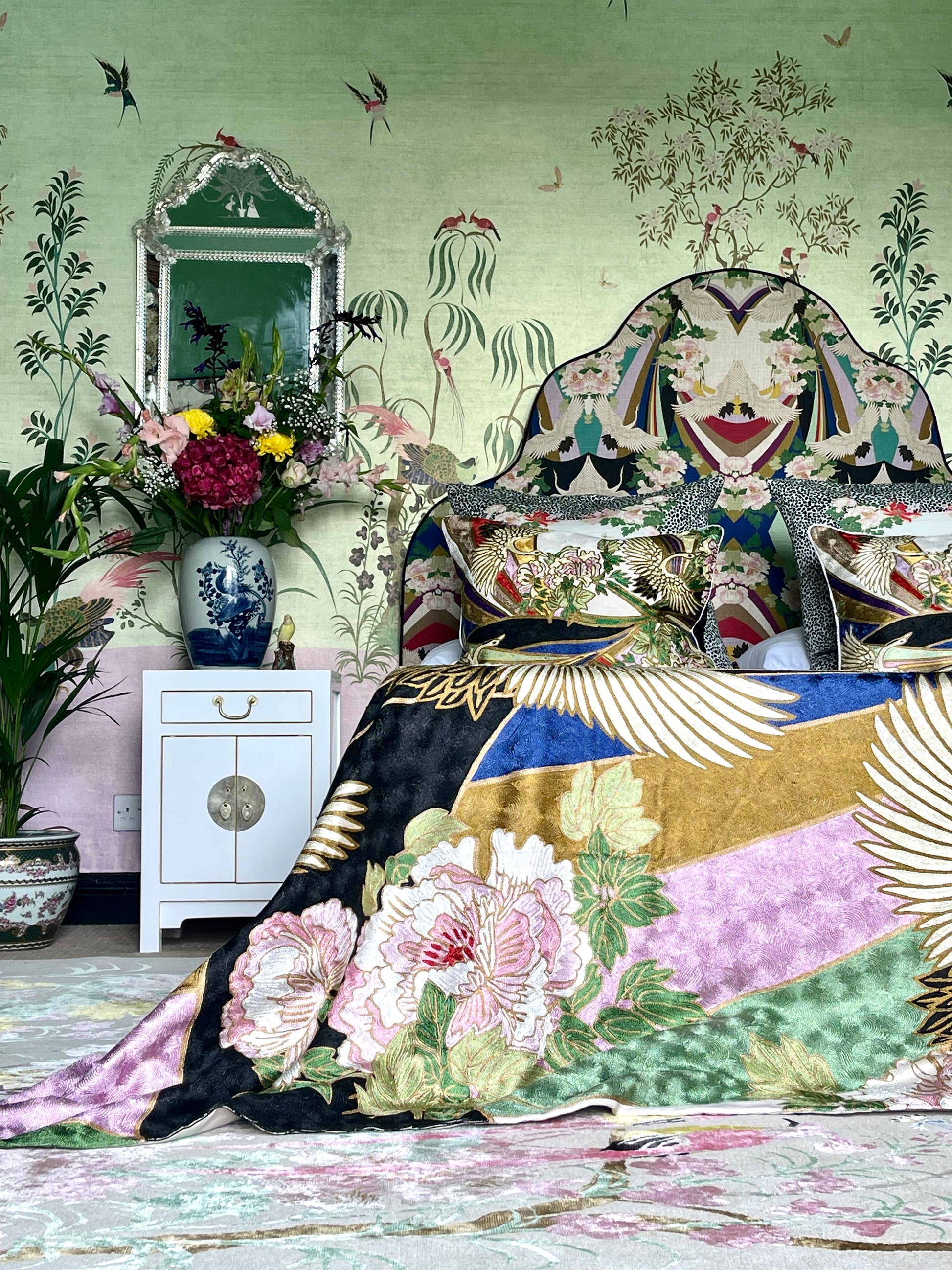 Full of life, hope and vitality, the colours range from reds, pinks, orange and lilacs through to aqua, greens, blues, yellow and gold; all beautifully balanced in an exotic, evocative yet-delicate design.