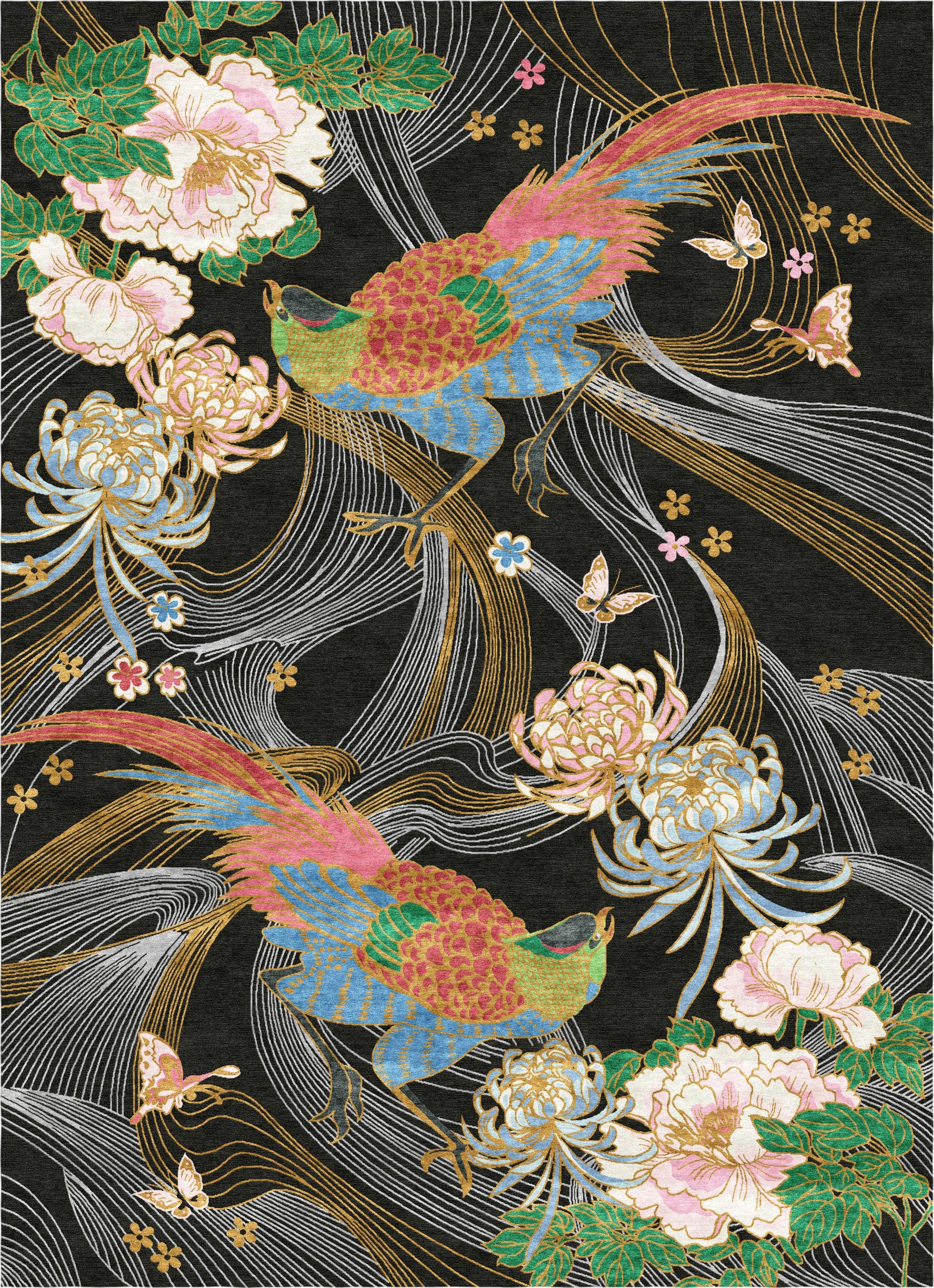 Inspired by the intricate embroidery of Japanese kimonos, this luxurious rug has a phoenix at its centre, which represents the cyclical nature of life, rebirth and renewal, surrounded by glorious chrysanthemums in full bloom and playful, fluttering butterflies.