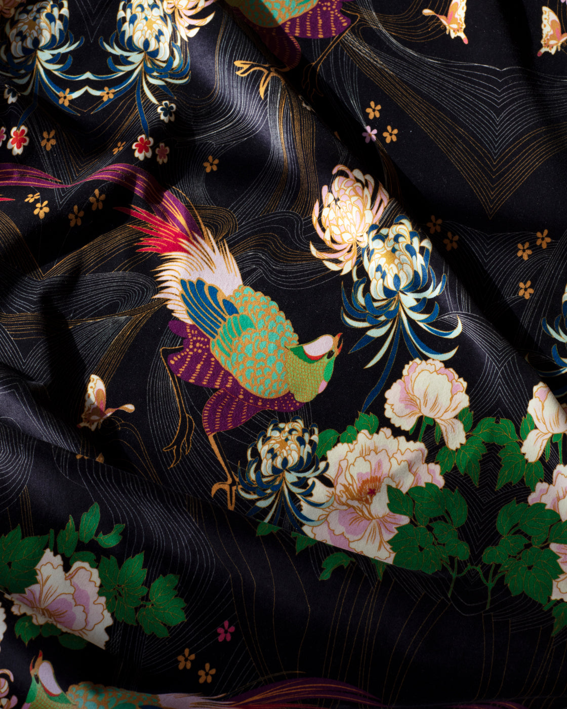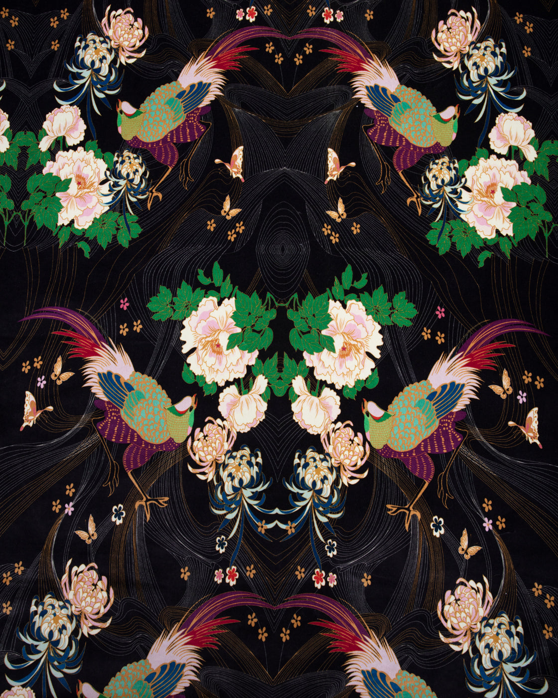 Our Phoenix fabric is a dramatic design; she is full of power, life and vigour, and inspired by our ever beautiful Hand Knotted Wool and Silk Phoenix Rug. This luxurious, tactile, life-affirming velvet will elevate any space.