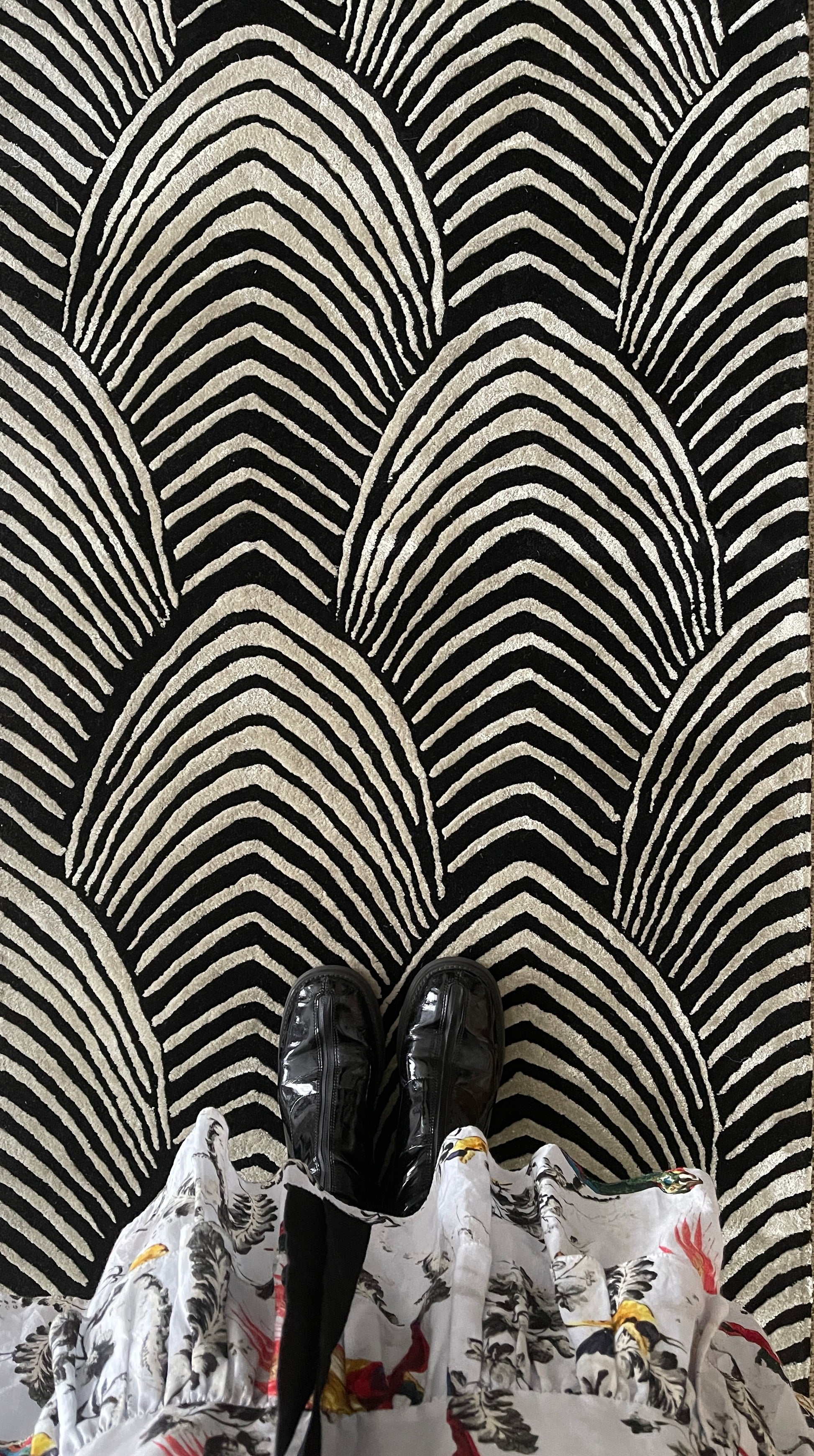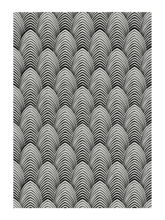 Inspired by Wendy’s Peacock design, the shimmering taupe repeat pattern of Plumage is a versatile, timeless classic. Contrasting black and taupe semi-circles converge, reminiscent of layered feathers, row upon row, creating a hypnotic design that draws the gaze.