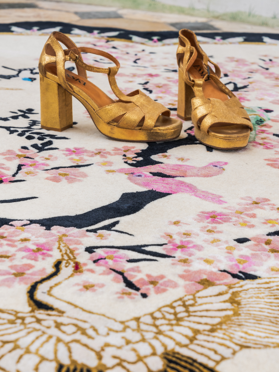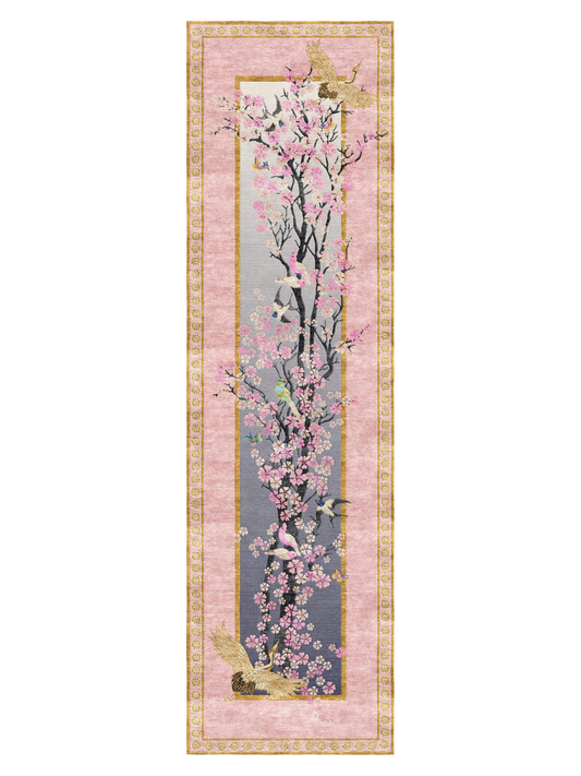 We hope everything about our Saku Hand-tufted Rug will make you smile. Full of glorious, life-affirming pink blossom petals, gold cranes and exotic birds, her connection with nature is obvious and highlighted even further by her gorgeous, curved, petal shape. A bold, black frame grounds the delicate design and makes her particularly easy to place.