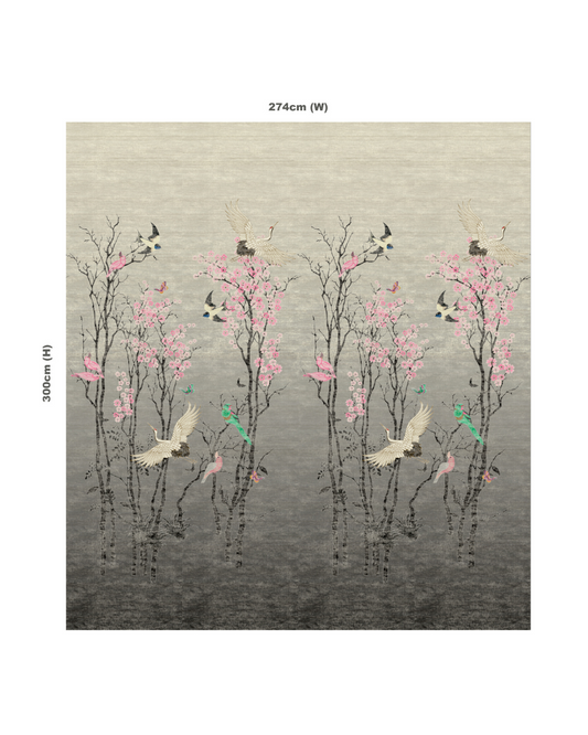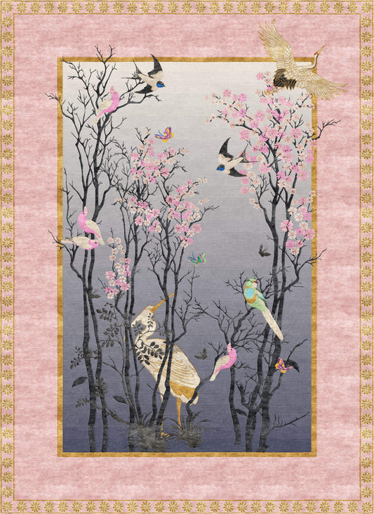 The hand-knotted runner is packed with blossom, bookended by soaring gold cranes, symbolising good luck and longevity. Each petal is formed by tiny pink love hearts, spreading across the soft grey base, drawing the eye onwards. The design highlights a powerful connection with and the sheer beauty of nature in all her glory.