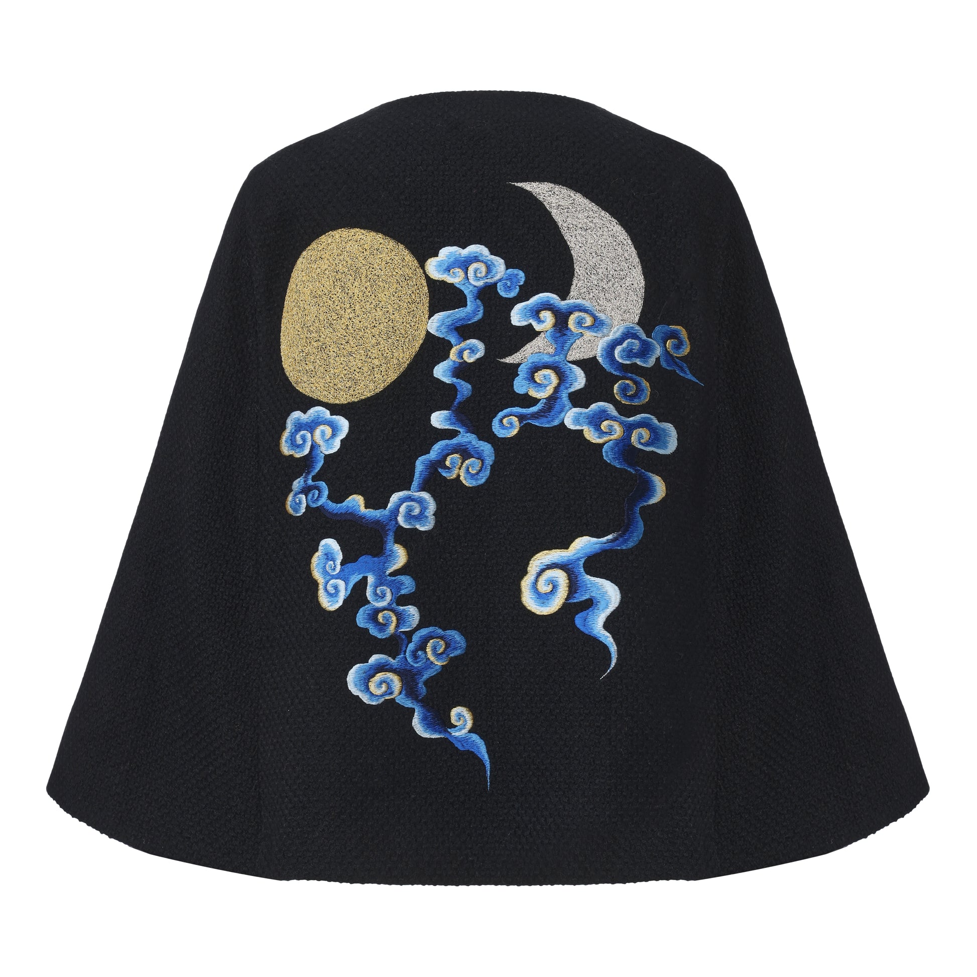 Turning to the back reveals a contrasting yet complementary narrative. Designed by Skylence, the embroidery draws inspiration from Wu Zetian, the first and only female emperor in Chinese history. The motif “Ri Yue Ling Kong” (日月凌空) — the sun and moon rising together — represents supreme authority, balance, and a woman standing at the very centre of power. Flowing clouds connect celestial elements, echoing ancient Chinese cosmology while remaining distinctly contemporary.
